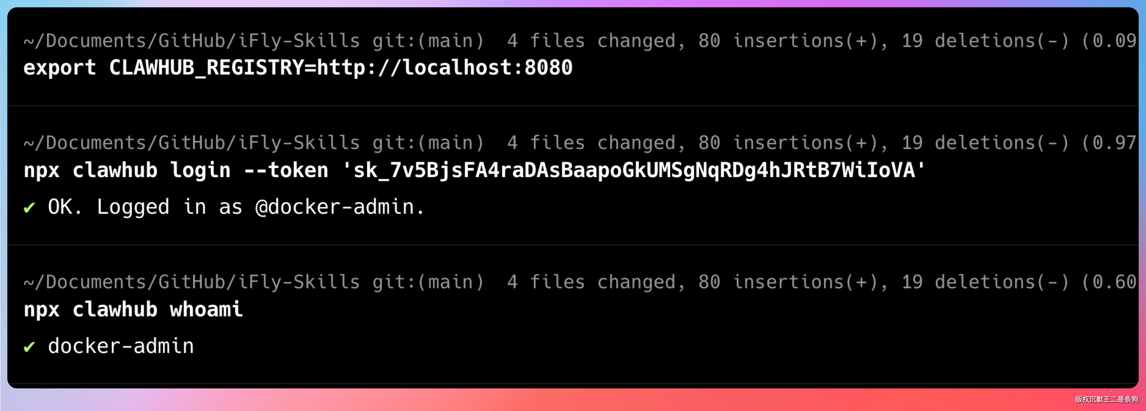 export CLAWHUB_REGISTRY=http://localhost:8080然后用刚才在 Web 里创建的 token 登录。