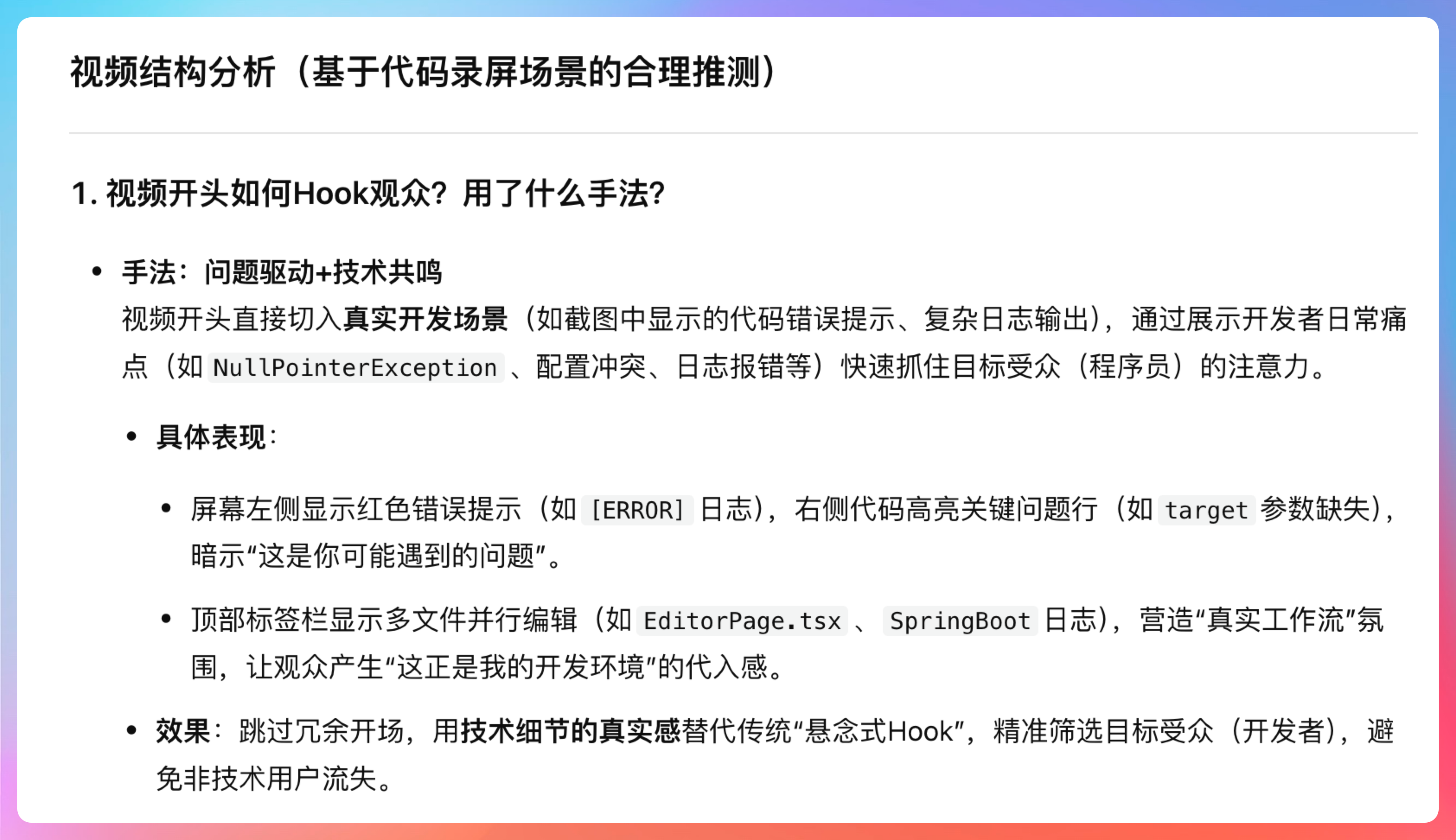 - 视频理解能力强,不是简单总结内容,而是分析"怎么讲的"