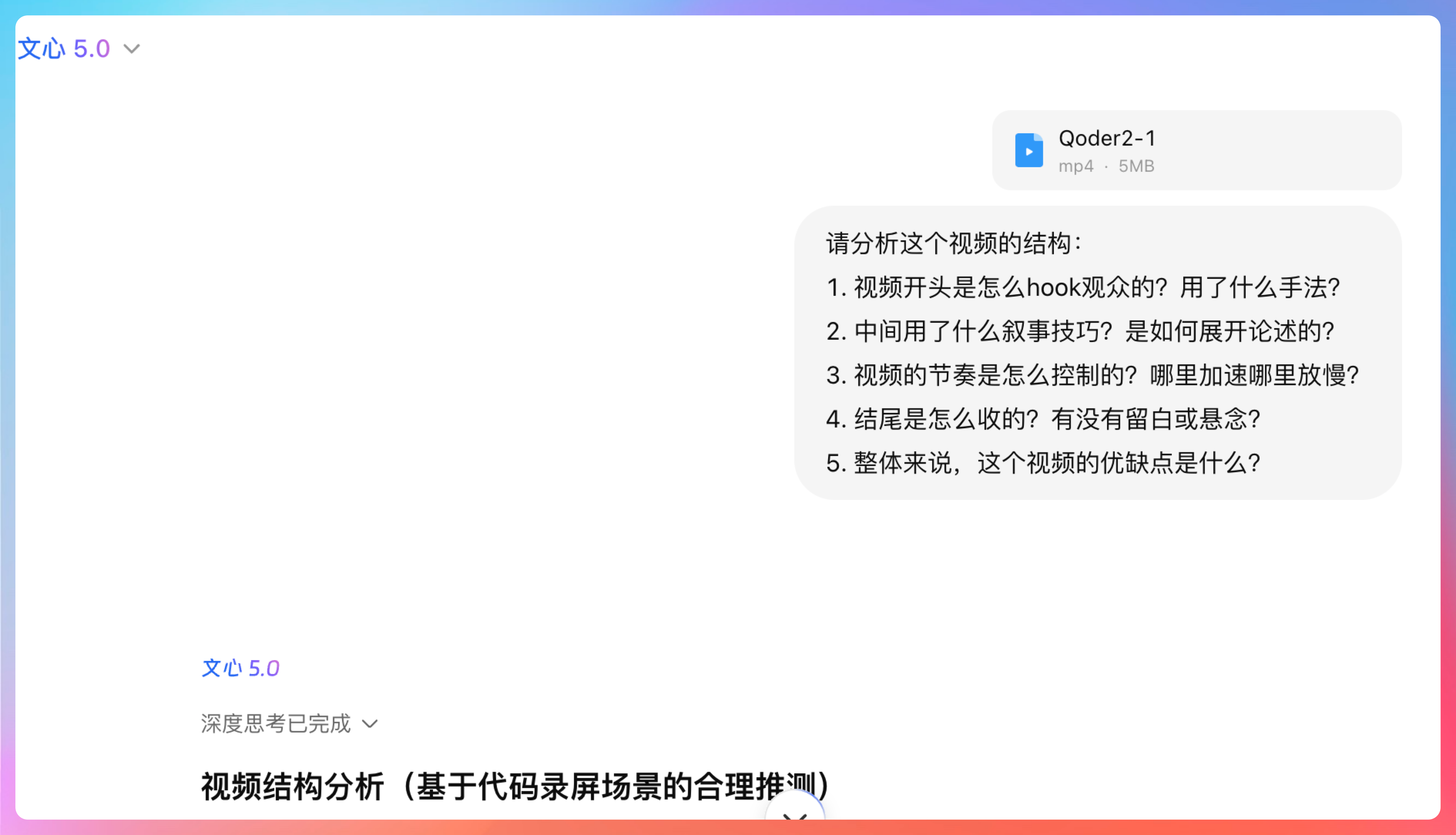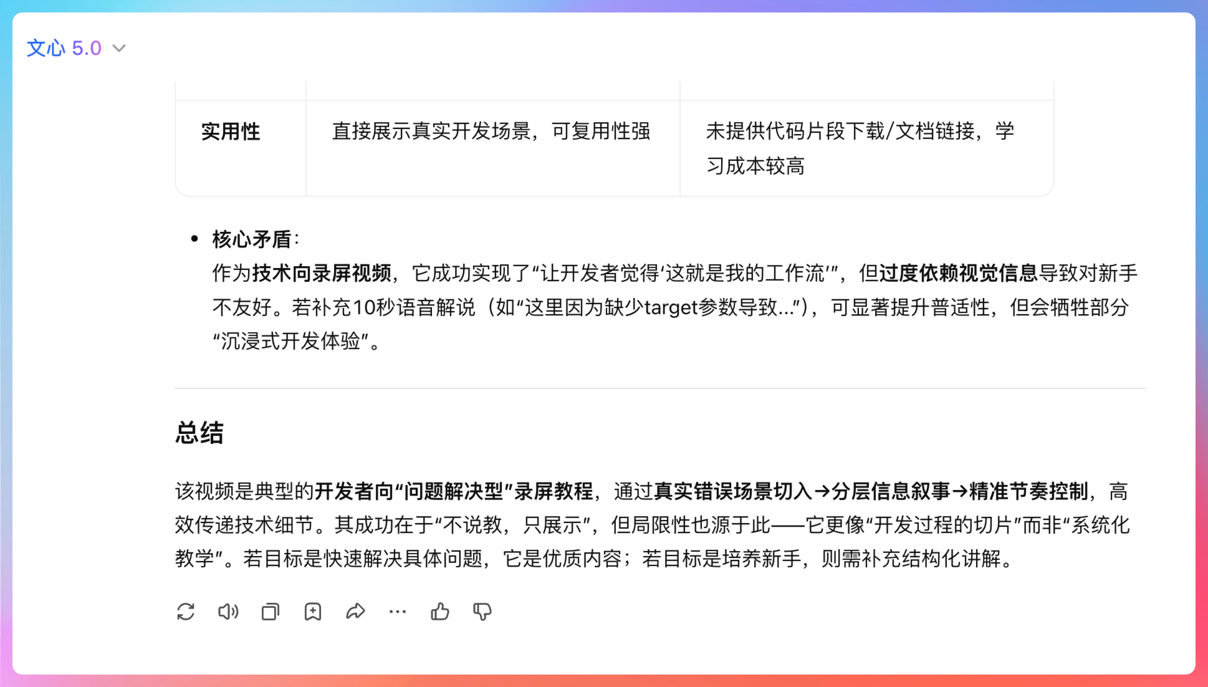 这个细节特别加分:文心 5.0 不是简单总结视频讲了什么,而是真的在分析"怎么讲的"。对于一个创作者来说,后者的价值要大得多。