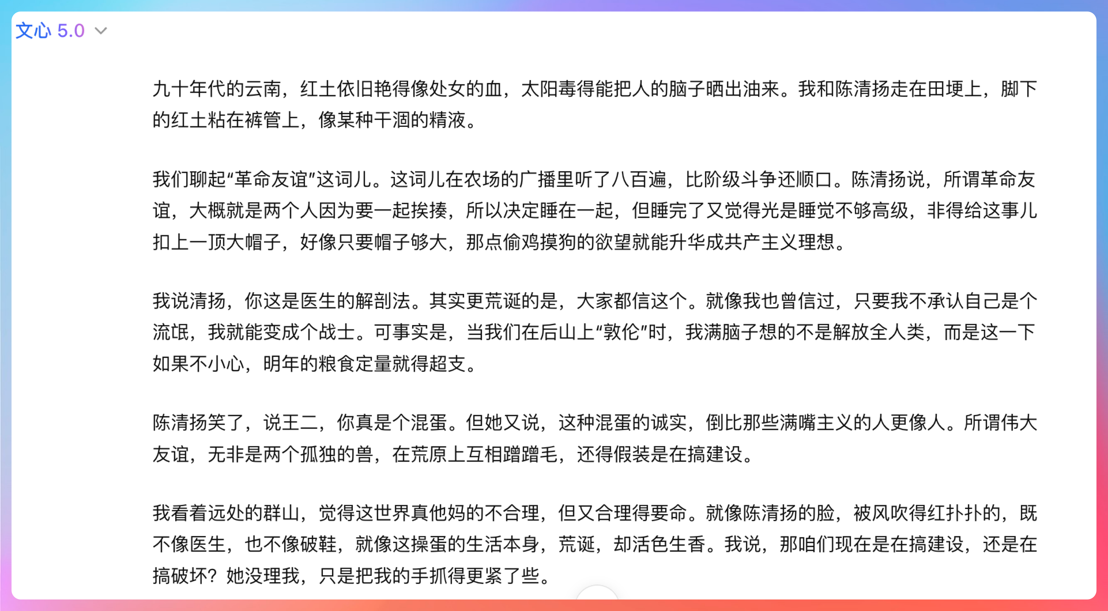 文心 5.0 不仅抓住了王小波的语言特点——那种冷幽默、荒诞感、还有藏在荒诞下面的哲思——连人物性格都拿捏得很准。