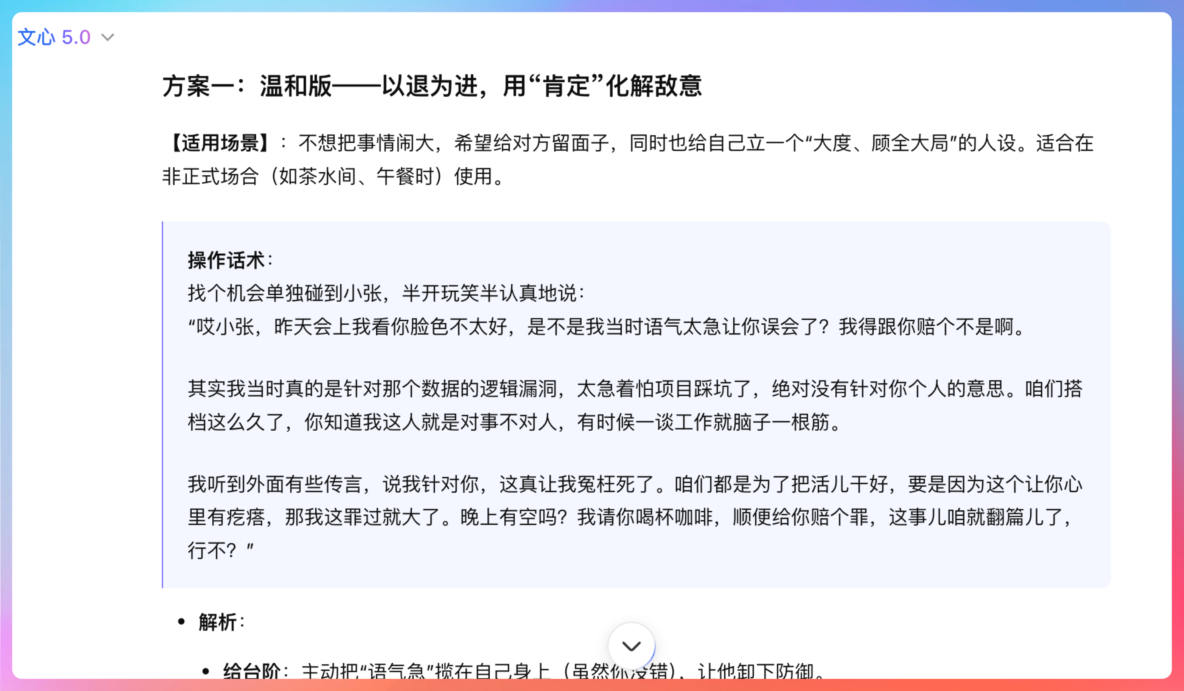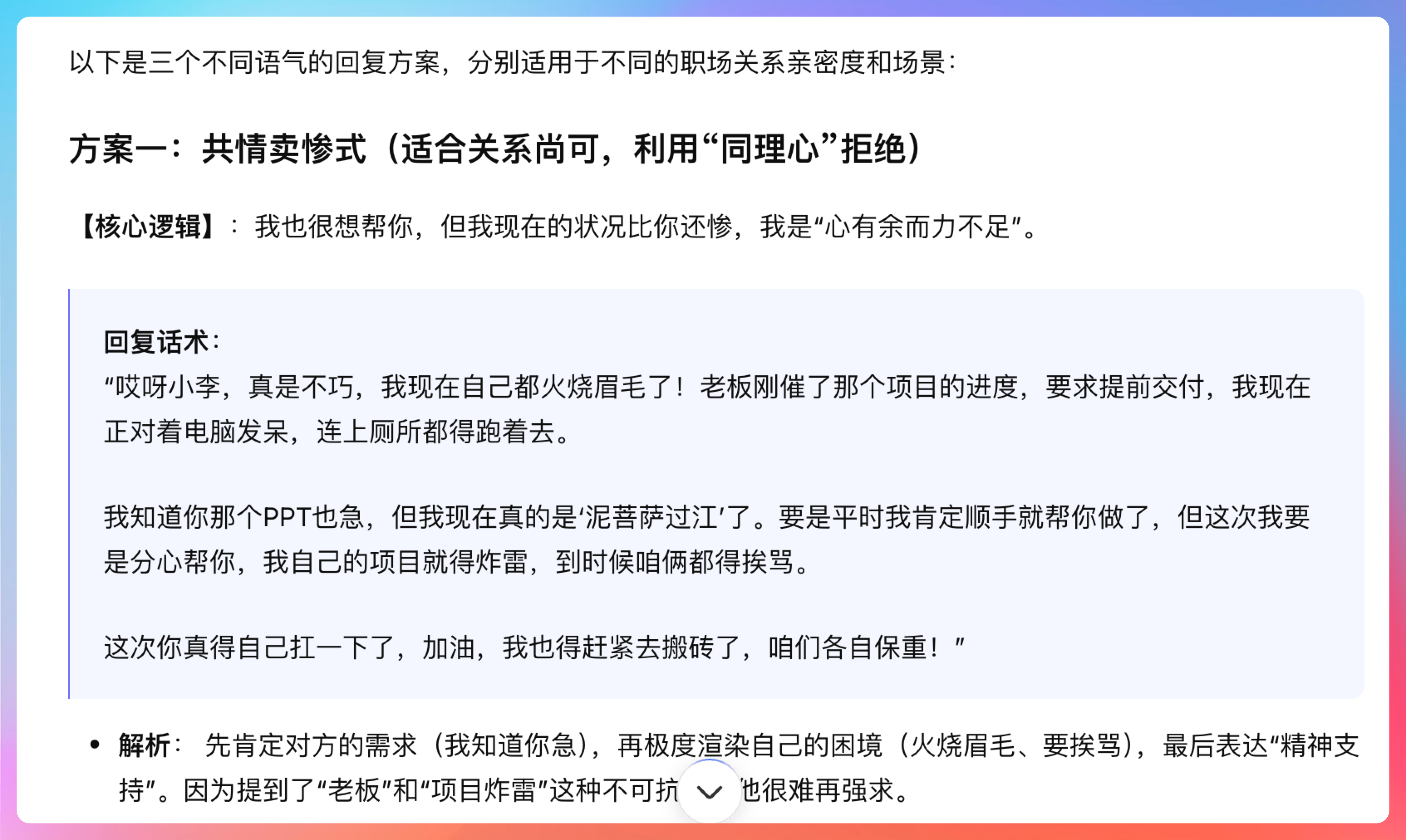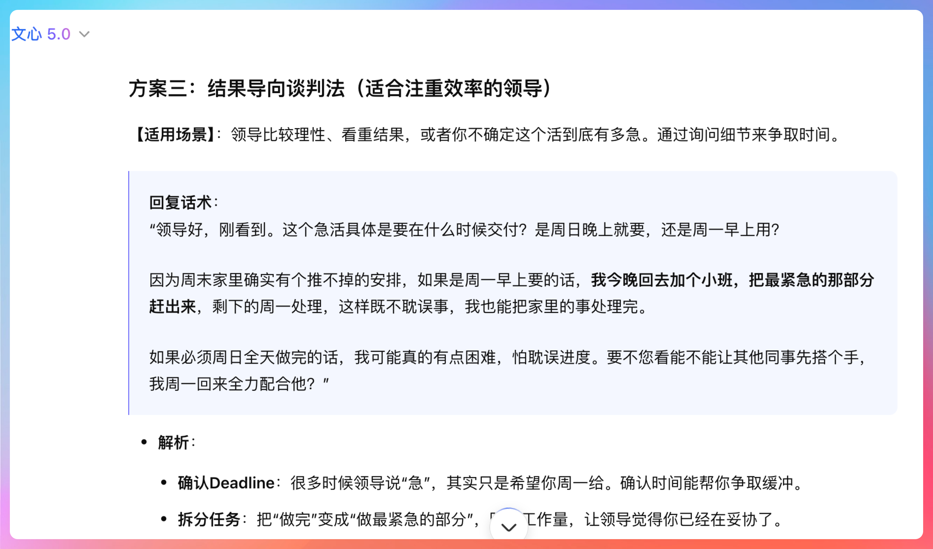 文心 5.0 不仅给出了具体的回复话术,还考虑了领导的心理——既要表达"我想帮忙",又要明确"这次真的不行",最后还要留个"下次我一定"的口子。
