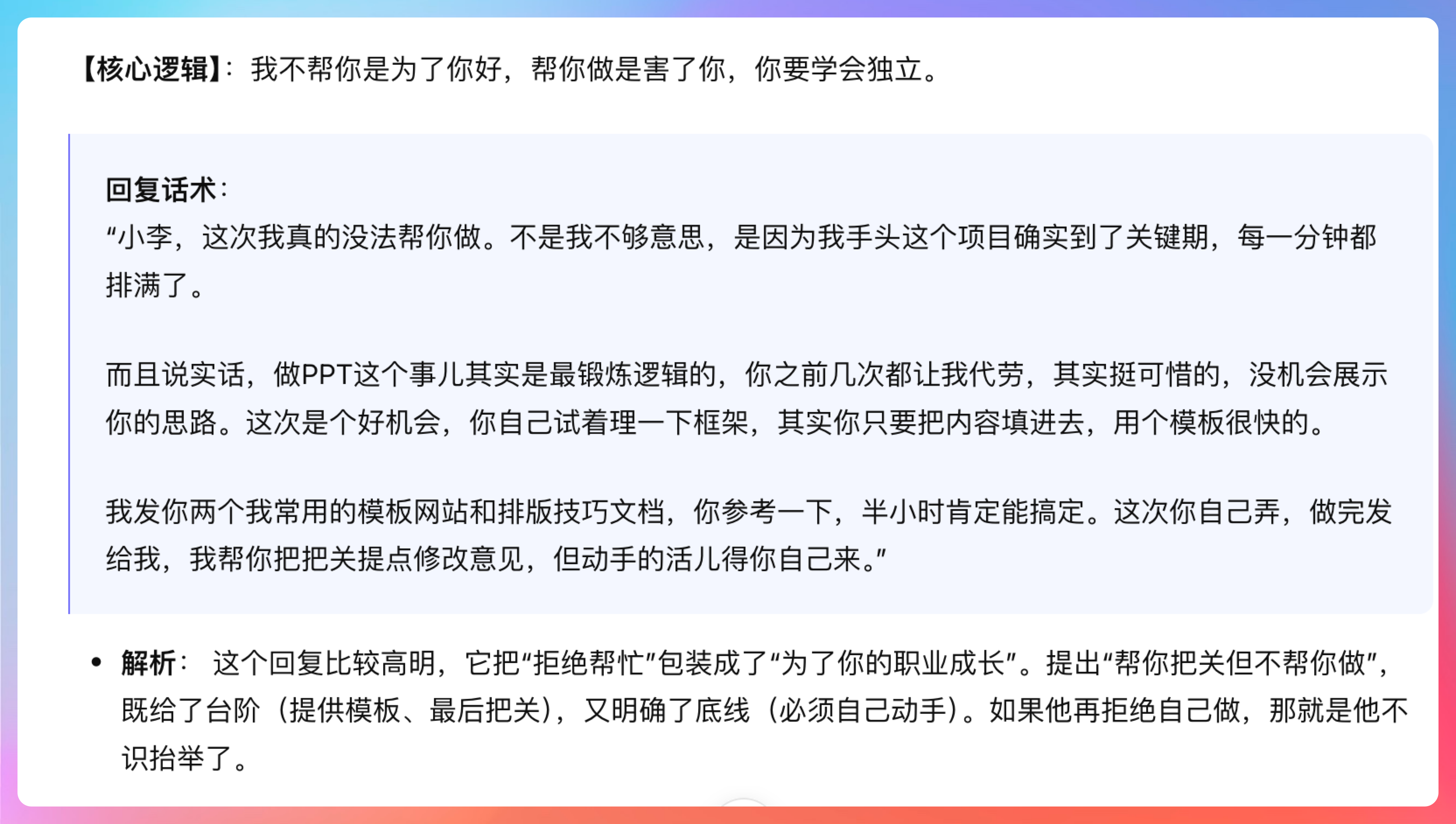 场景:你正在赶一个重要项目,同事小李跑过来让你帮他做一个PPT,说"反正你做PPT快,帮我弄一下吧"。