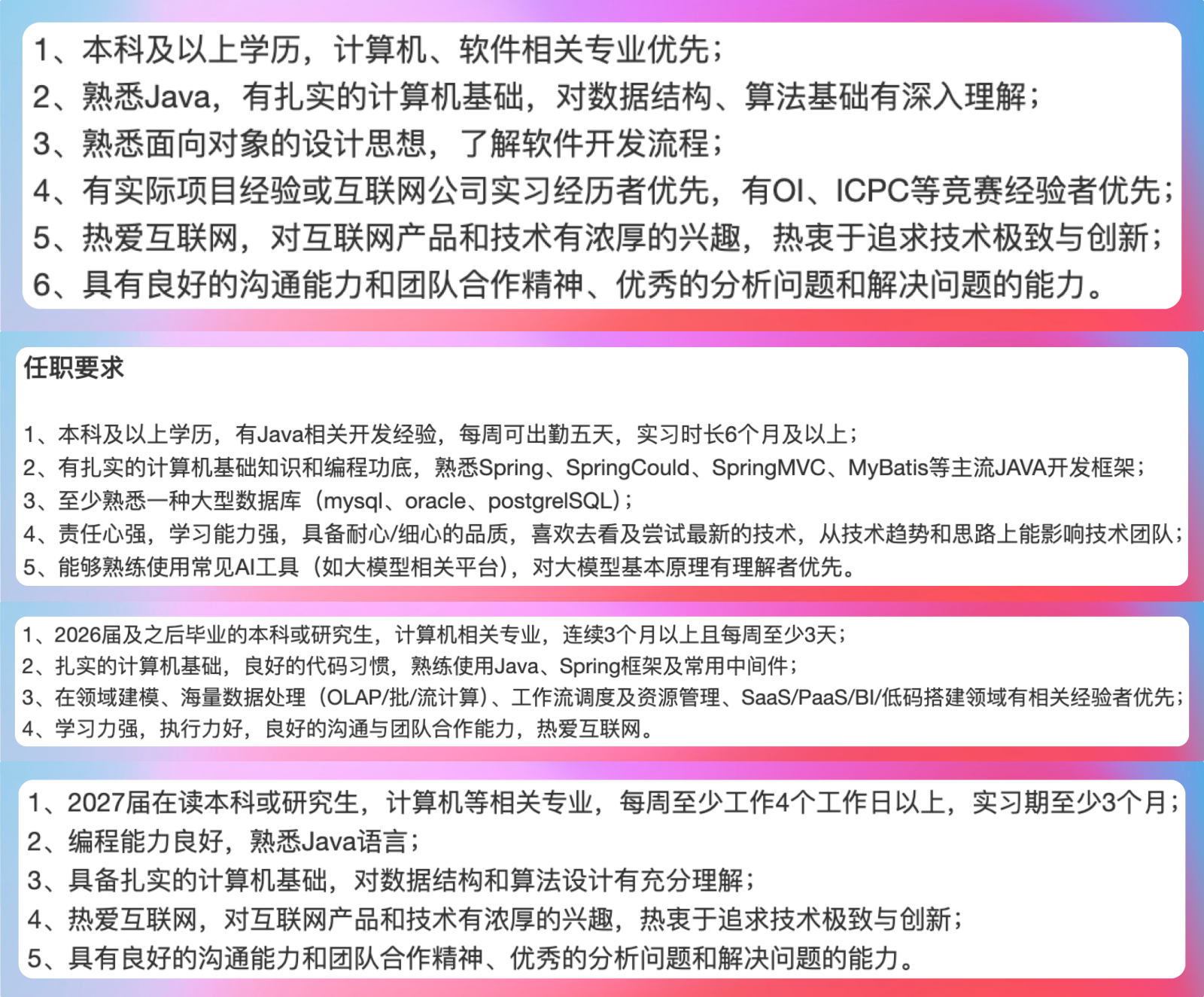 还有一点需要提醒大家,快手也是一个Java大户,我查了很多后端岗位的JD,发现里面都有Java相关技术栈的要求,比如说 Spring、Spring Cloud、MySQL 等等。