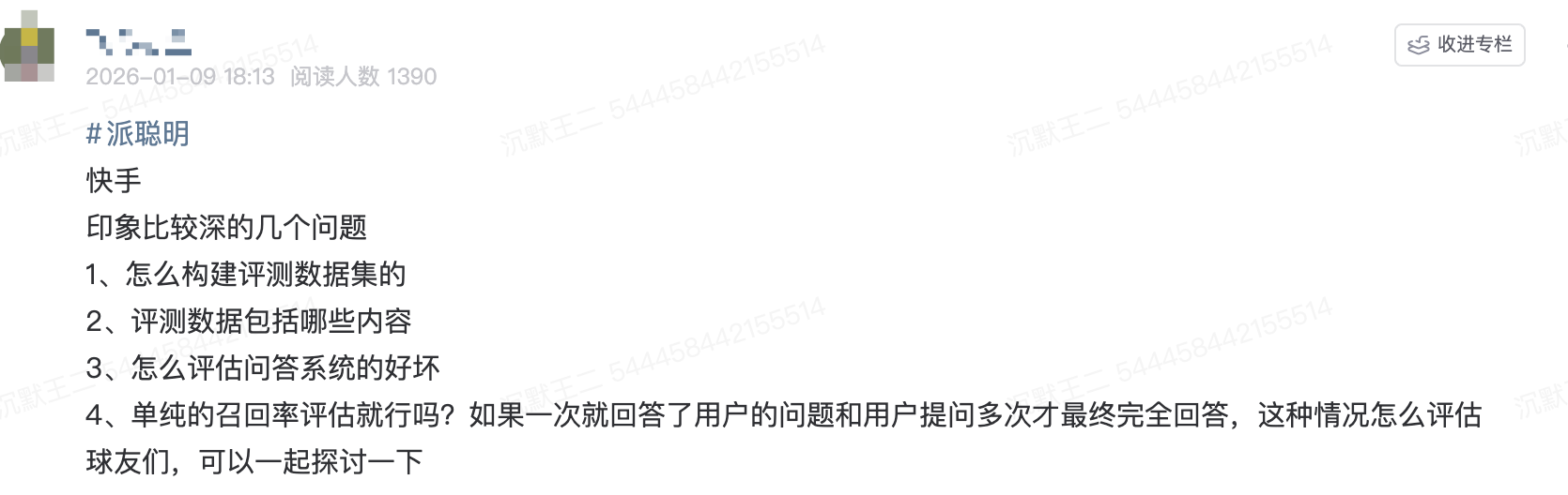 接下来,再给大家分享几道派聪明RAG项目的面试题,是一位面快手的球友分享的。
