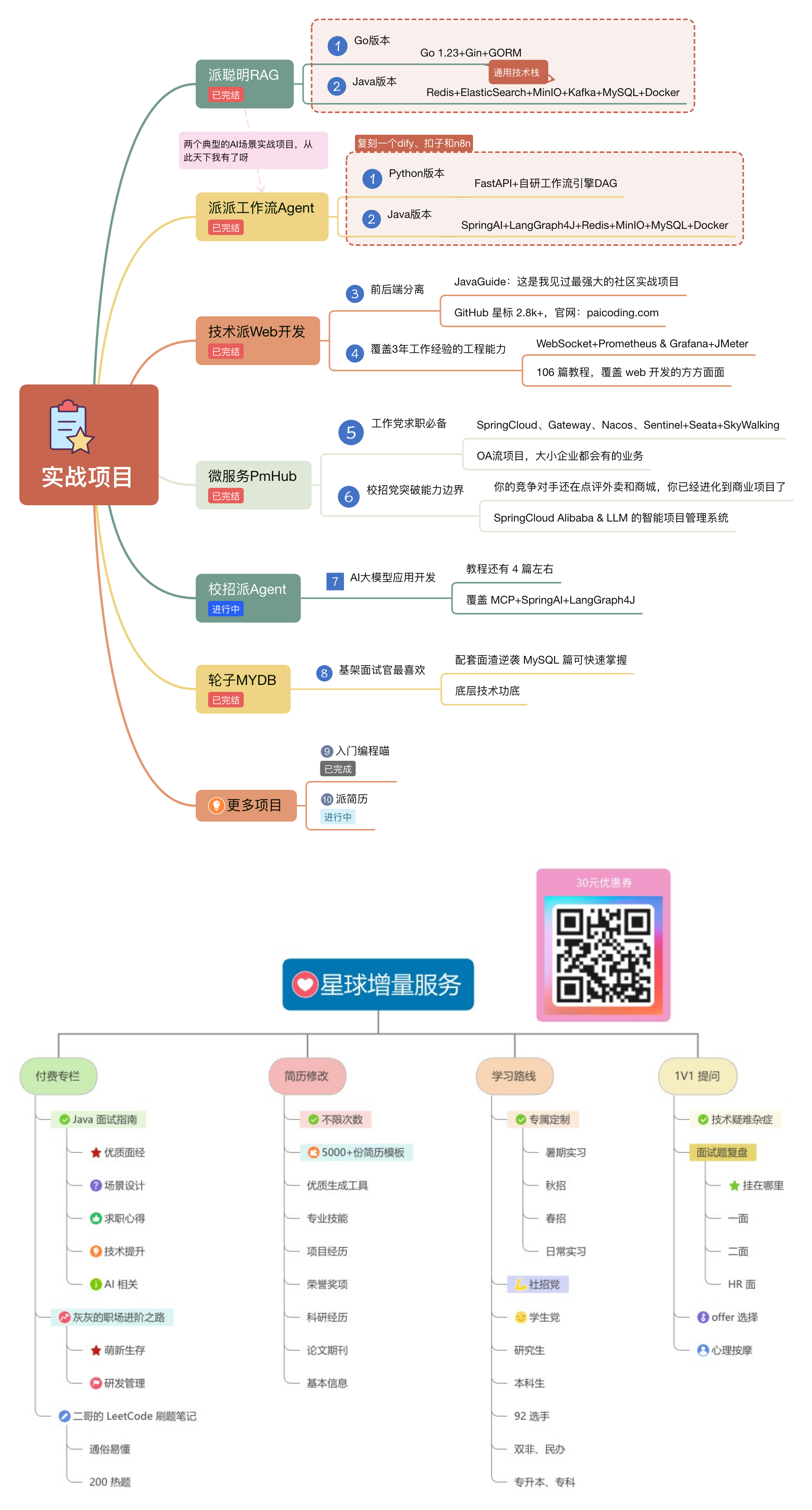- 1、付费文档: 派派工作流Agent、派聪明 RAG Java 版/Go版、微服务 PmHub、前后端分离技术派、轮子 MYDB、入门编程喵、AI+MCP 的校招派等项目配套的 60 万+ 字教程查看权限