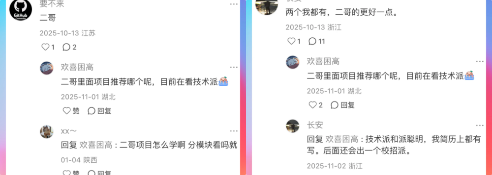 - 3、专属问答: 向二哥和星球嘉宾发起 1v1 提问,内容不限于 offer 选择、学习路线、职业规划等