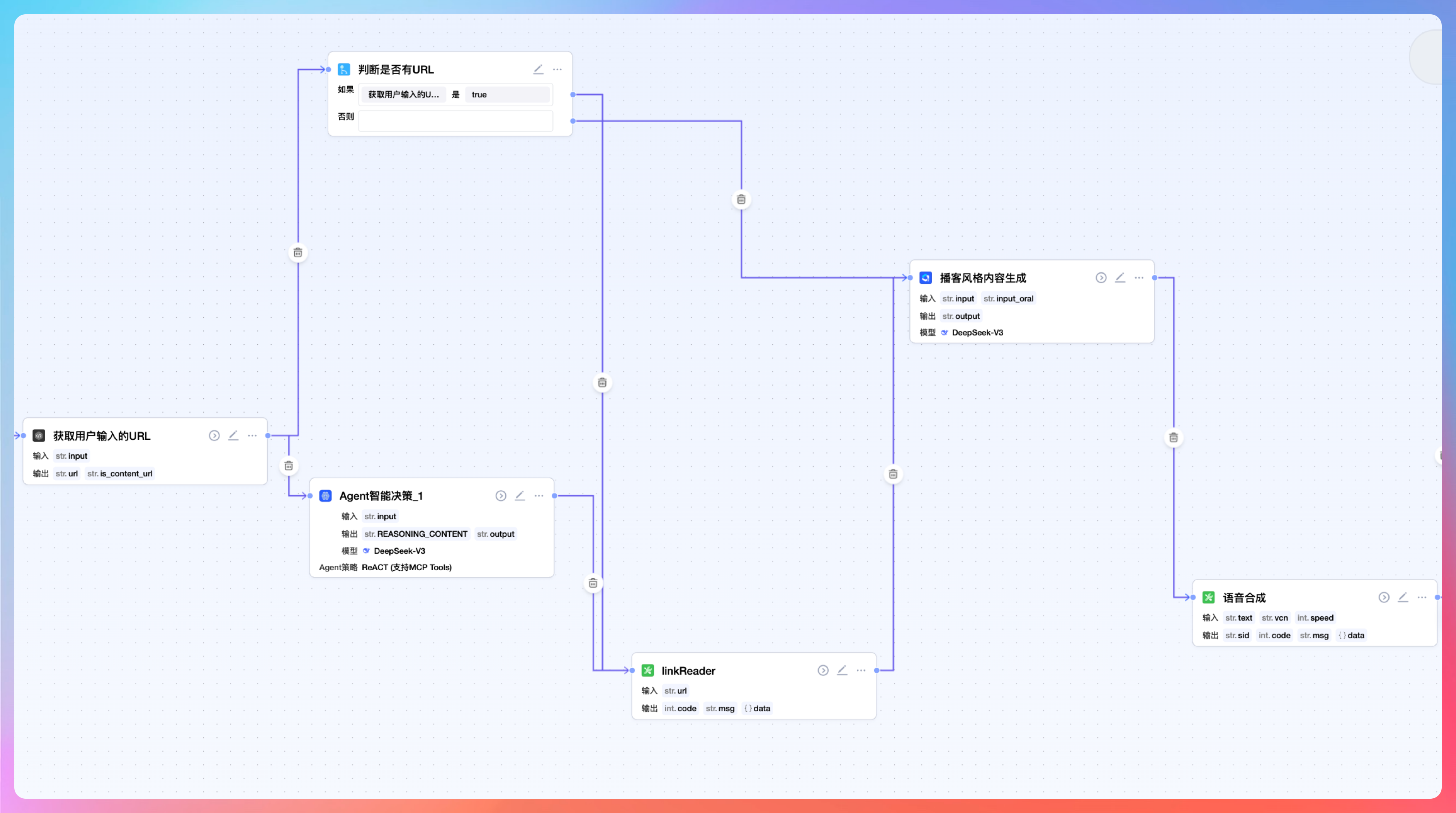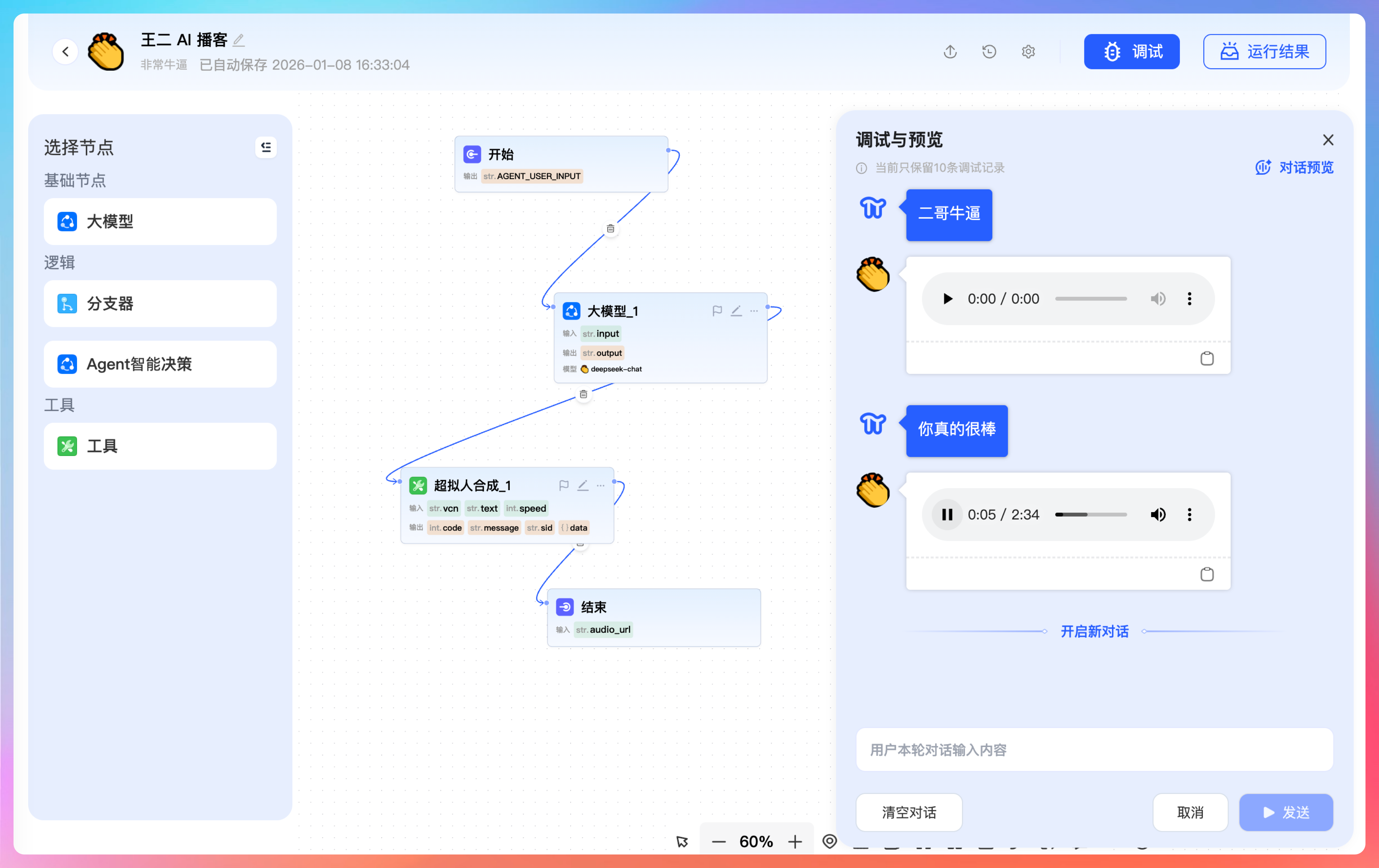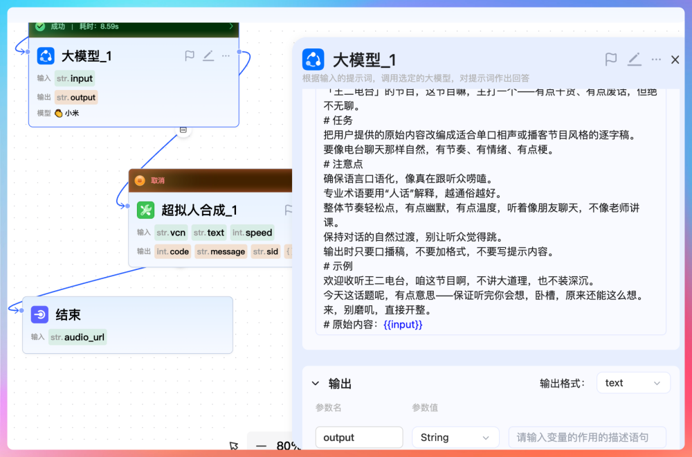 第一期我们主要交付这个工作流——用户输入一个主题,大模型将其转换为播客风格的文本,再经过TTS将其转换为音频内容,主要包括四个节点:输入→LLM→超拟人音频合成→输出(支持节点并行执行)。