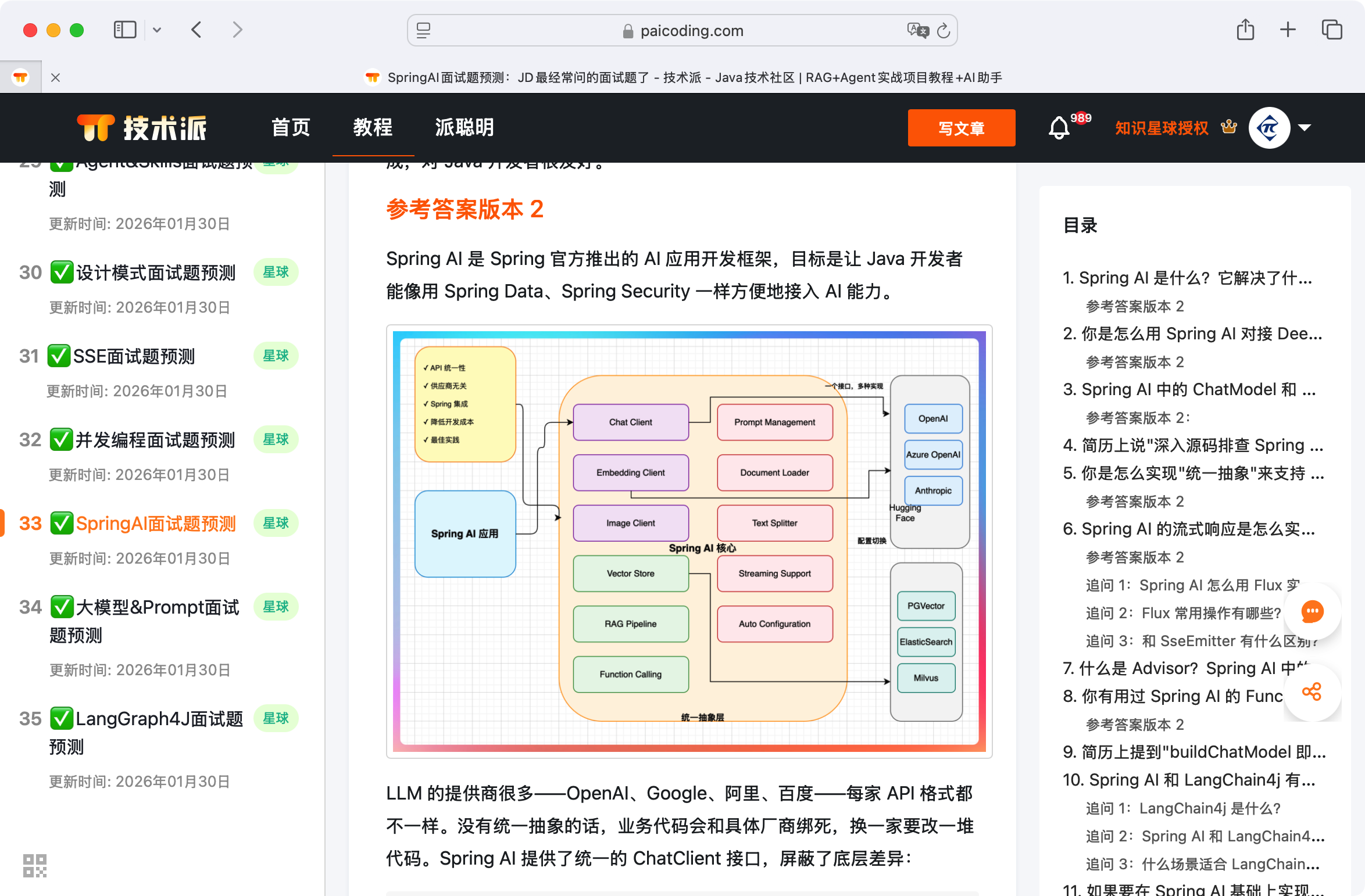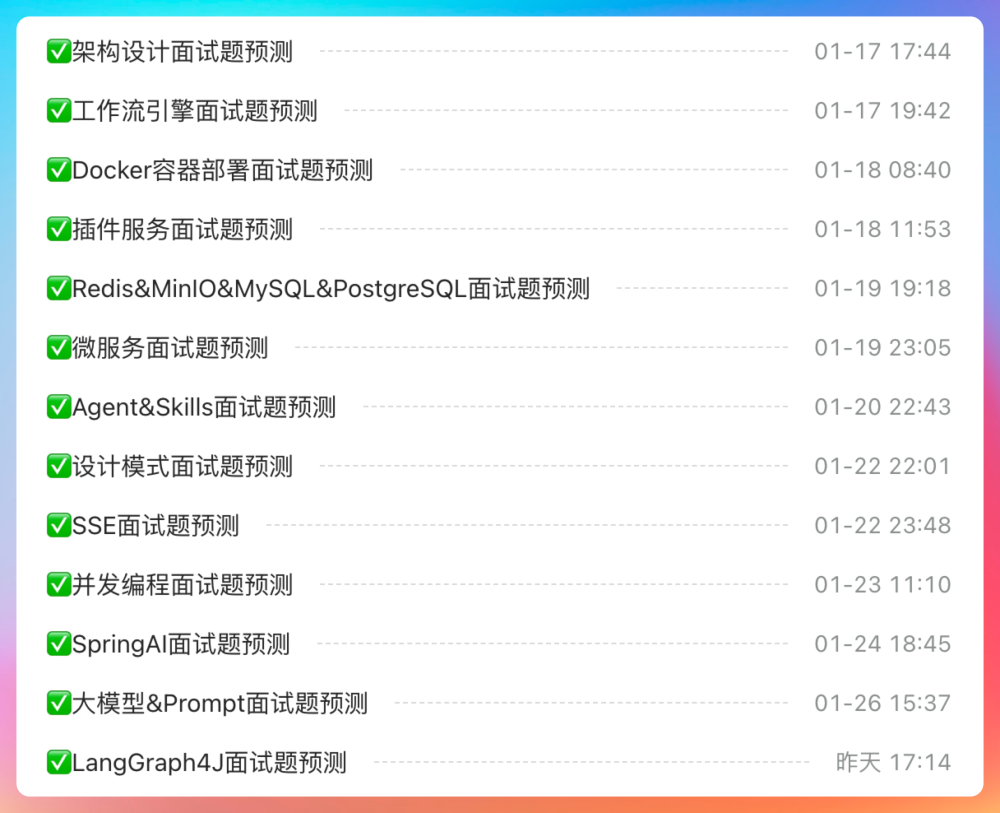 下面是面试篇的教程,都是当今最流行的面试题型,包括Agent&Skills、SpringAI、LangGraph4J、大模型&AI面试题、SSE、Docker、微服务等等,目前均已完稿,足足200道,覆盖了AI应用开发的方方面面。