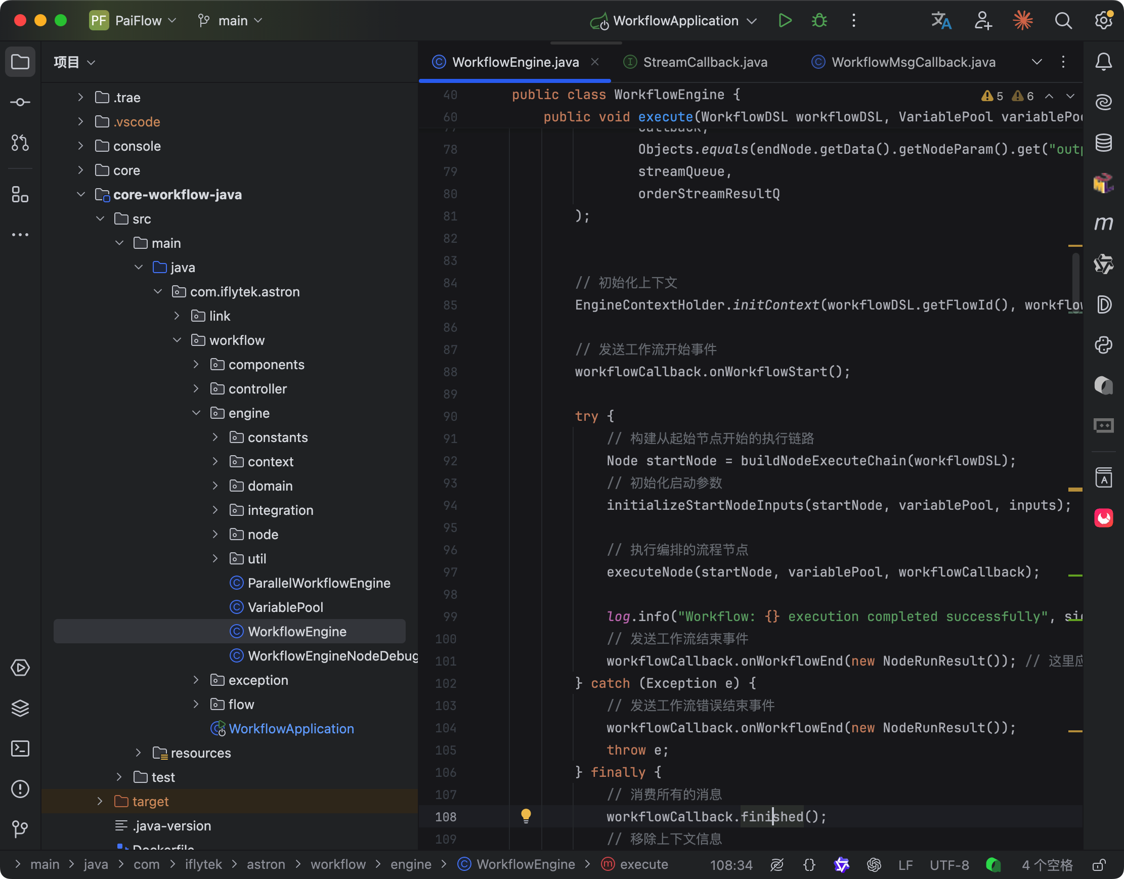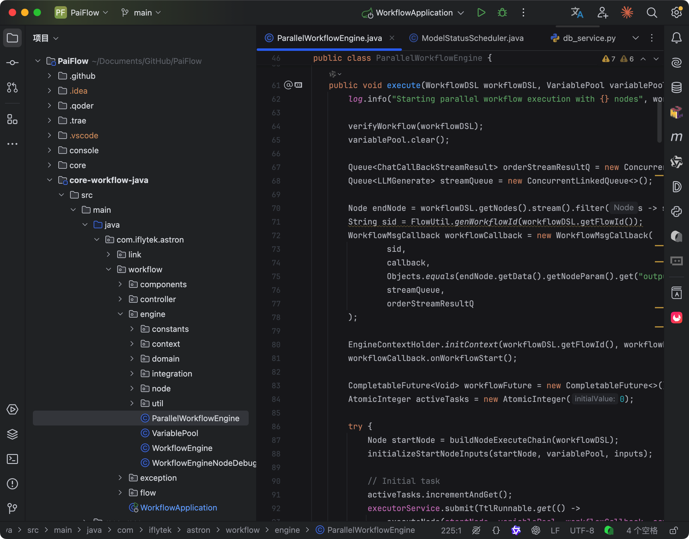 工作流引擎是PaiFlow最核心,也是最复杂的部分,既有Python版本,也有Java版本。主要负责DSL的解析与校验、节点的调度与执行顺序控制、上下文和参数的管理、链路的拓扑解析,以及执行过程中状态的变更和事件推送。