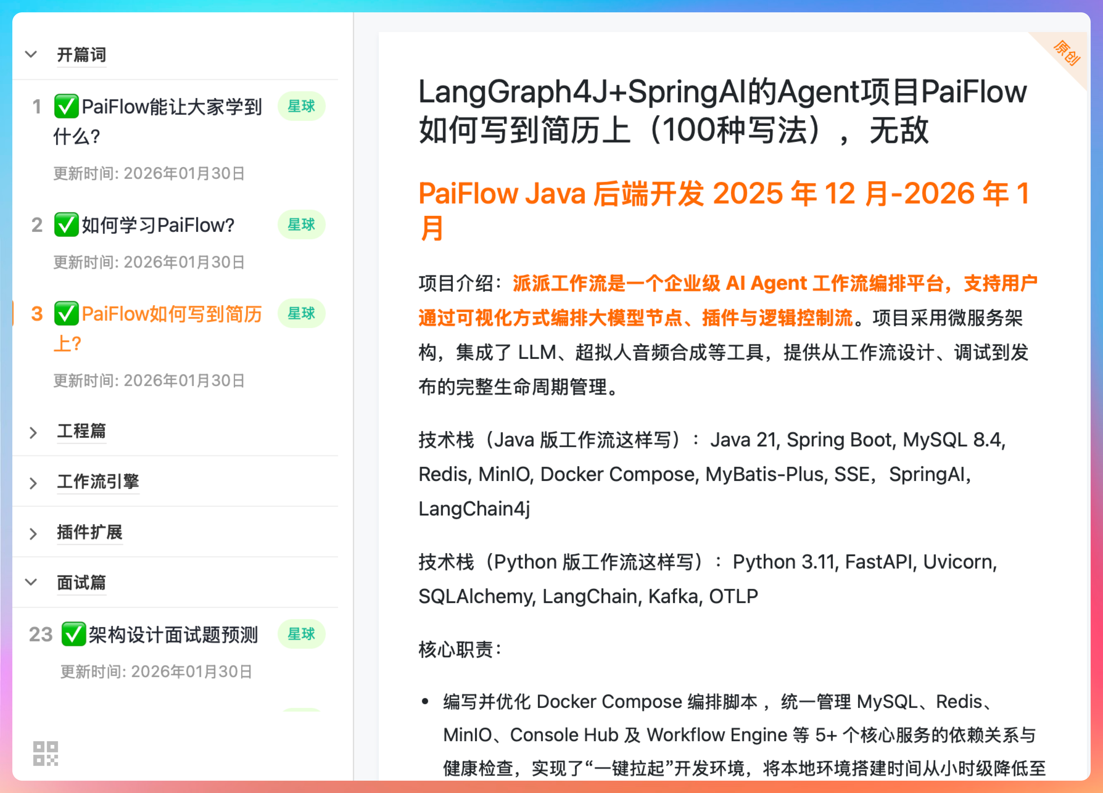 - 适合具备Java/Python后端基础,想补个AI工作流Agent项目的实习/校招/社招同学