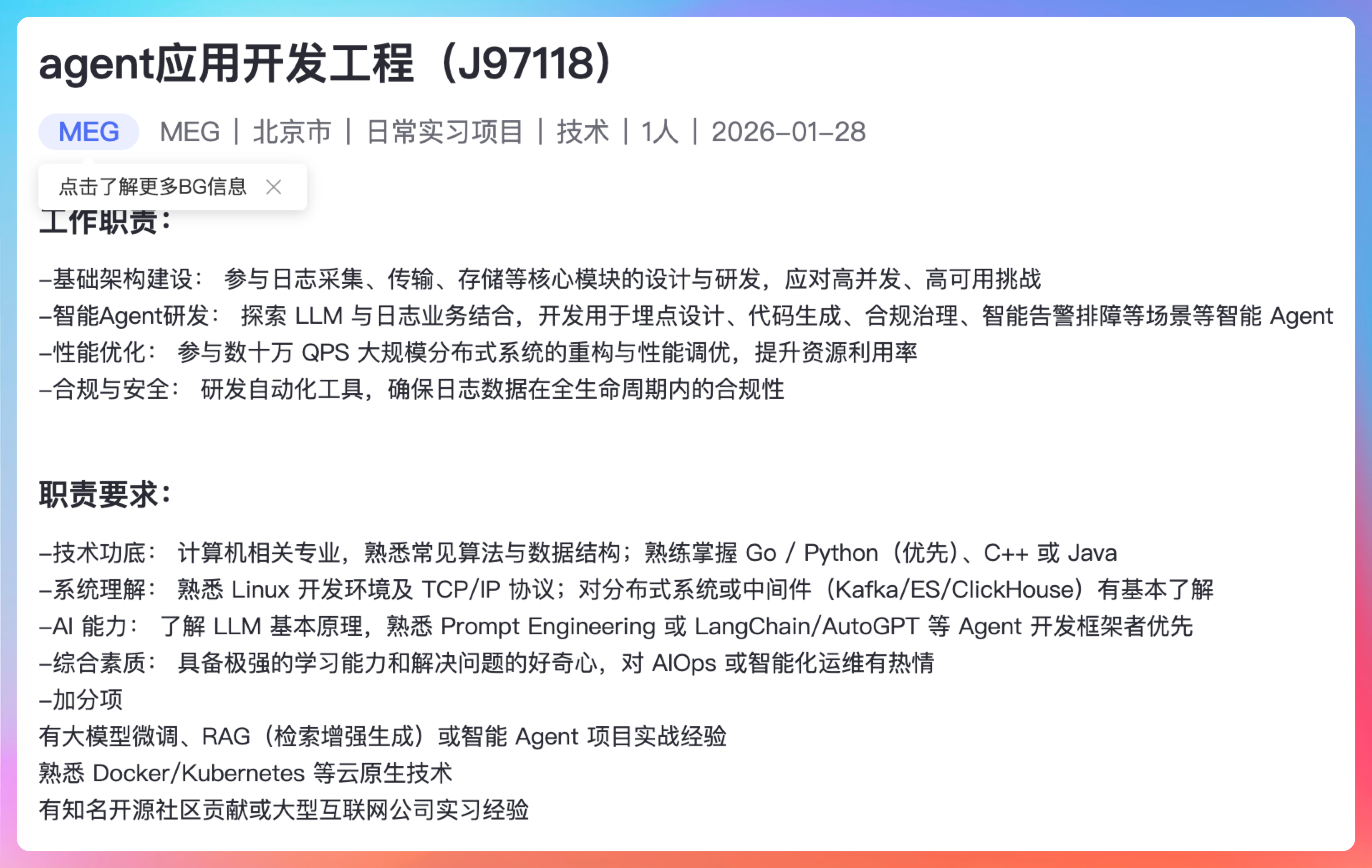 大家看一眼这个Agent应用开发工程师的招聘要求,有智能体Agent研发、LLM基本原理、分布式、Prompt、LangGraph、Docker、RAG等等,PaiFlow几乎全部囊括了。