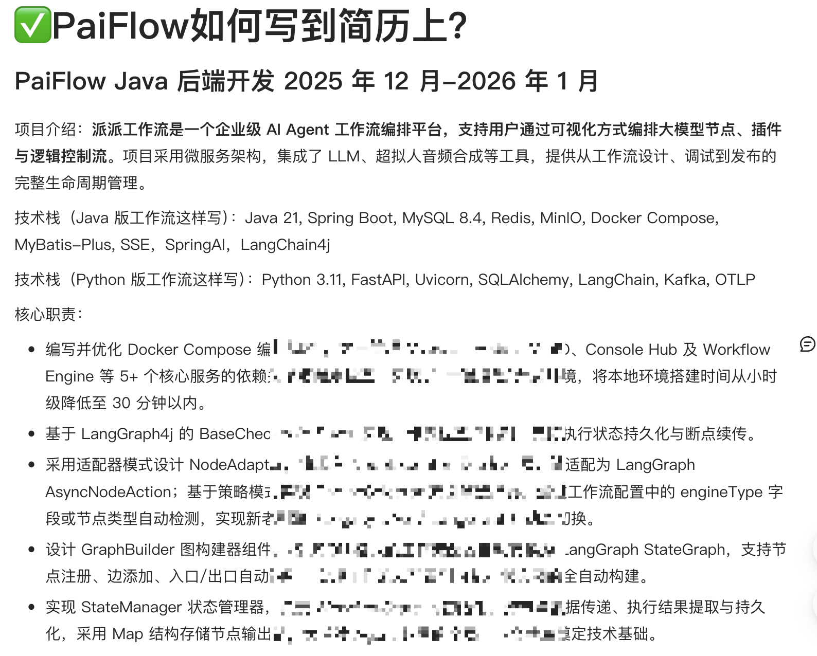 看一眼PaiFlow写到简历上的部分内容吧,都是AI时代强需求的技能点,所向披靡没问题。