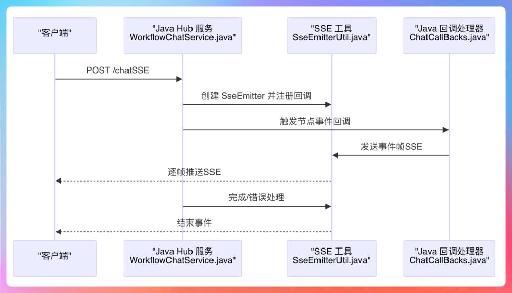 在整个工作流引擎的交互链路里,我们实现了一个基于SSE的实时推送机制,用于将节点执行状态和LLM输出内容第一时间同步给前端。