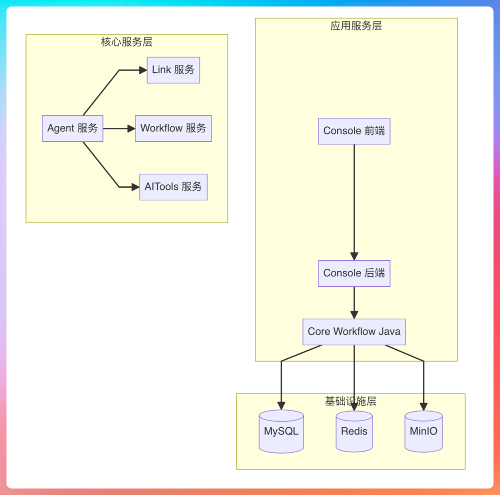 整个项目架构可以拆成四层:前端表达层、控制台中枢层、工作流执行层,以及底层基础设施层。