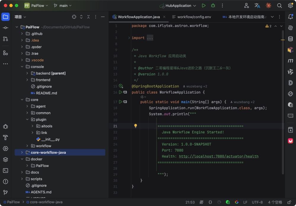 你启动Python版工作流引擎,hub就会自动将工作流的执行请求发送到core模块下的workflow、aitools和link服务;你启动的是Java版工作流引擎,hub就会自动将工作流的执行请求发送到core-workflow-java模块下,并等待返回。