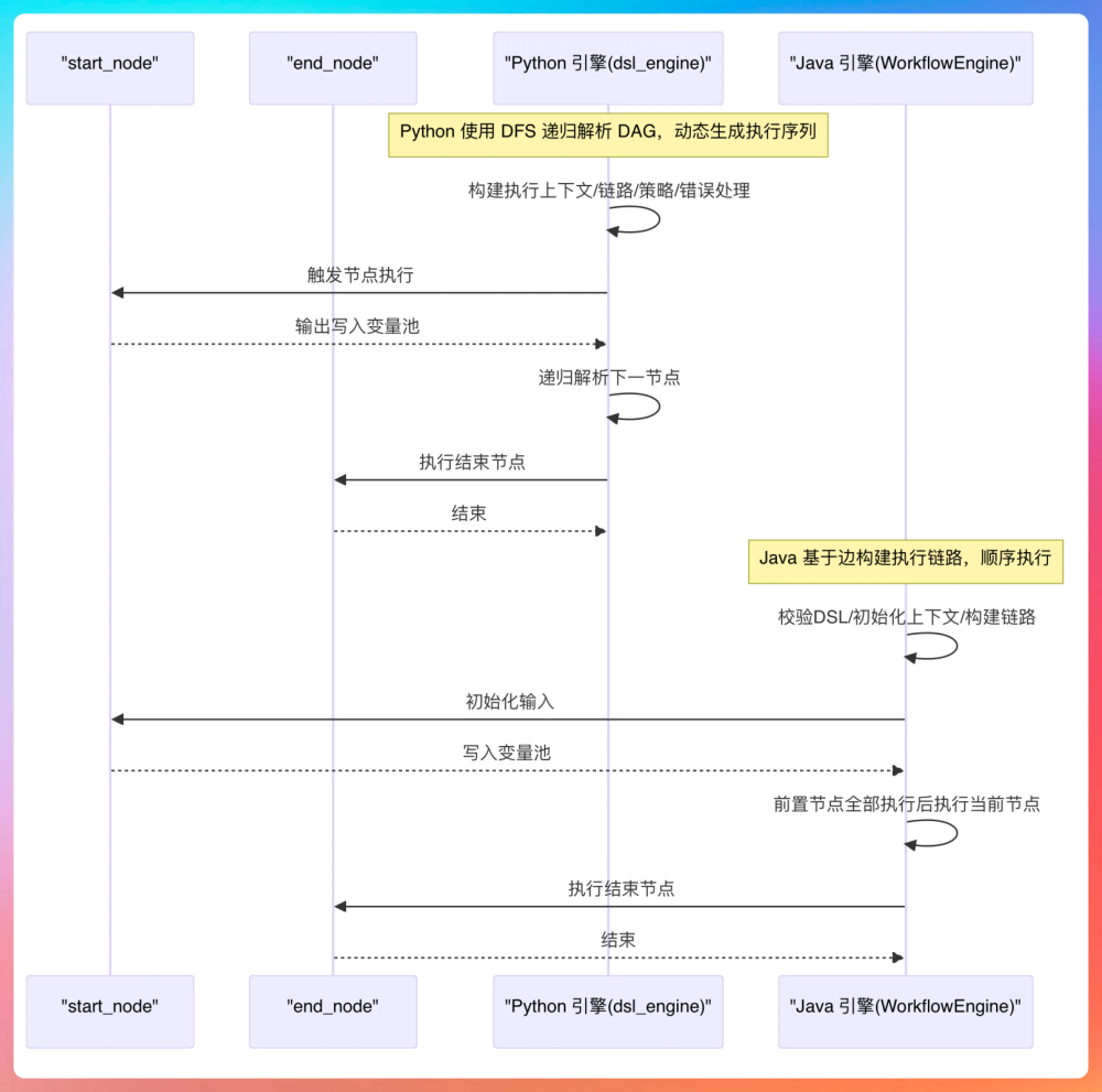 所以我主动承担起了这个职责,用 Java 重写一遍。我设计了基于策略模式的执行器架构,WorkflowEngine 实现了一个通用的 DAG(有向无环图)调度器,负责解析 DSL,管理节点间的依赖关系,并执行工作流。