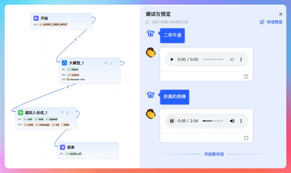 {{input}}④、插件节点调用内置的讯飞/千问的超拟人语音合成工具,或者第三方的其他 TTS 工具把改写后的文本转成音频,如果文稿内容比较多,这里需要切片后再调用插件服务,最后把合并后的音频文件上传到 MinIO,返回 URL。