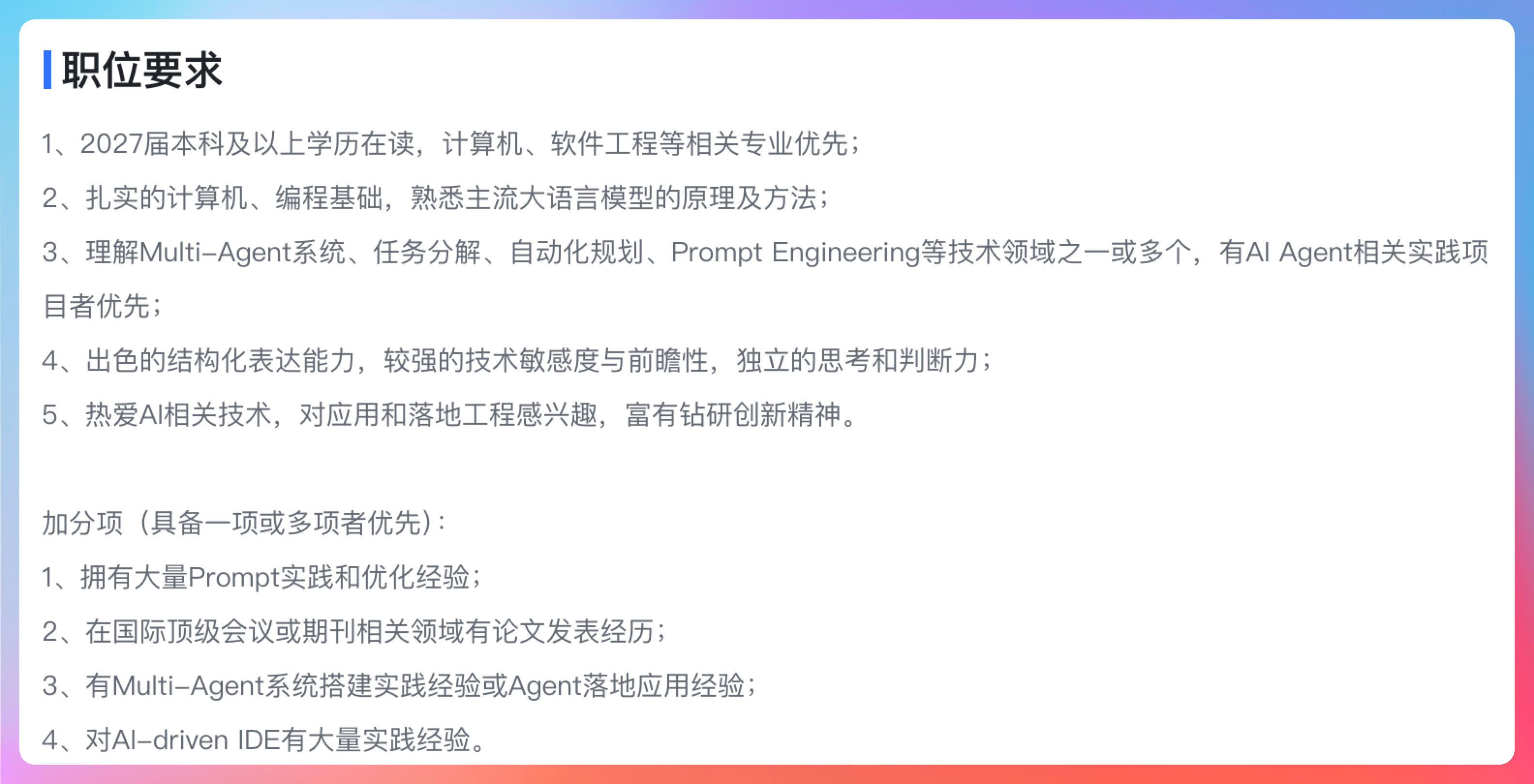 我去帮大家确认了一下,确实大量的 AI Agent 相关岗位,并且 JD 中 AI 的浓度特别的高。就拿这个 Agent 研发实习生来说吧。