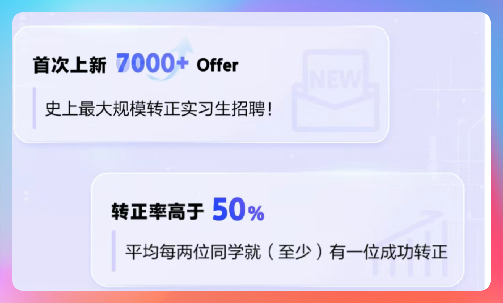 好家伙,终于等到了!我们牛笔轰轰的宇宙厂,官宣今年新招 7000 人,史上最大规模的暑期实习。并且转正率超过 50%。