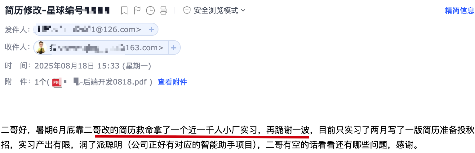 memo:2025 年 8 月 17 日修改至此。今天在帮球友修改简历的时候,收到他的反馈说:上次也麻烦我帮他改了改简历,也顺利找到了实习,秋招逼近,希望我能再帮他看看实习经历。感谢球友的每一次口碑。