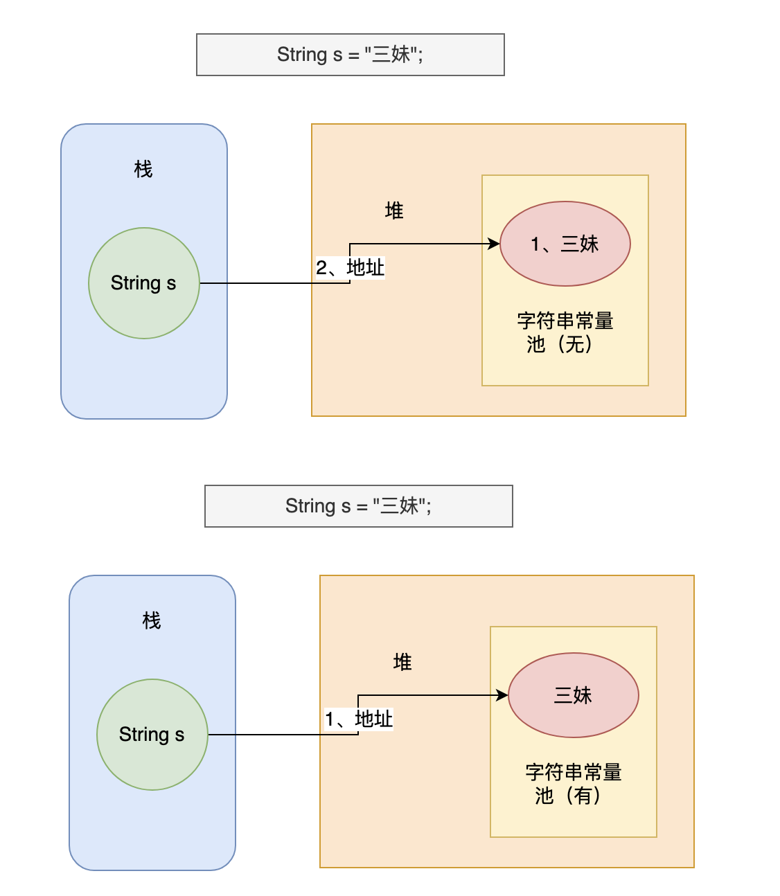 “如果没有,先在字符串常量池中创建一个‘二哥’的字符串对象,然后再在堆中创建一个‘二哥’的字符串对象,然后将堆中这个‘二哥’的字符串对象地址返回赋值给变量 s。”