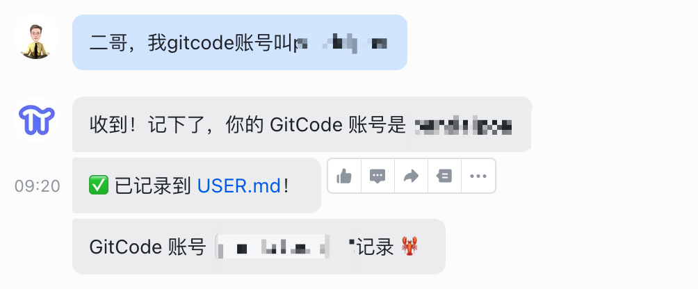 上来直接搞错方向,把我发的 GitCode 审核请求,当成了我对数字身份的要求,认认真真给我保存到了 USER.md 里。